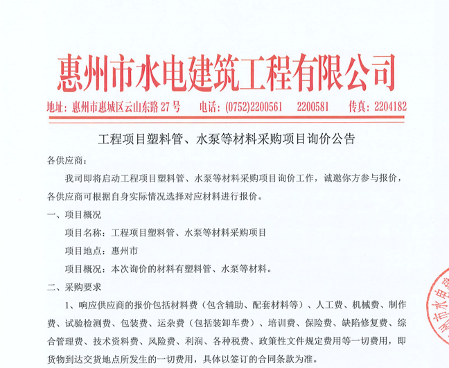 惠州市水電建筑工程有限公司成立于一九六四年四月,隸屬惠州市水務(wù)集團(tuán)有限公司,是一家國有綜合性施工企業(yè),主營水利水電工程、房屋建筑、市政工程等施工業(yè)務(wù)。公司擁有水利水電工程施工總承包一級、建筑工程施工總承包一級、市政公用工程施工總承包一級、公路工程施工總承包三級,公路路基、路面及建筑裝修裝飾專業(yè)承包二級,環(huán)保工程、機(jī)電安裝、河湖整治、輸變電工程專業(yè)承包三級等經(jīng)營資質(zhì)……